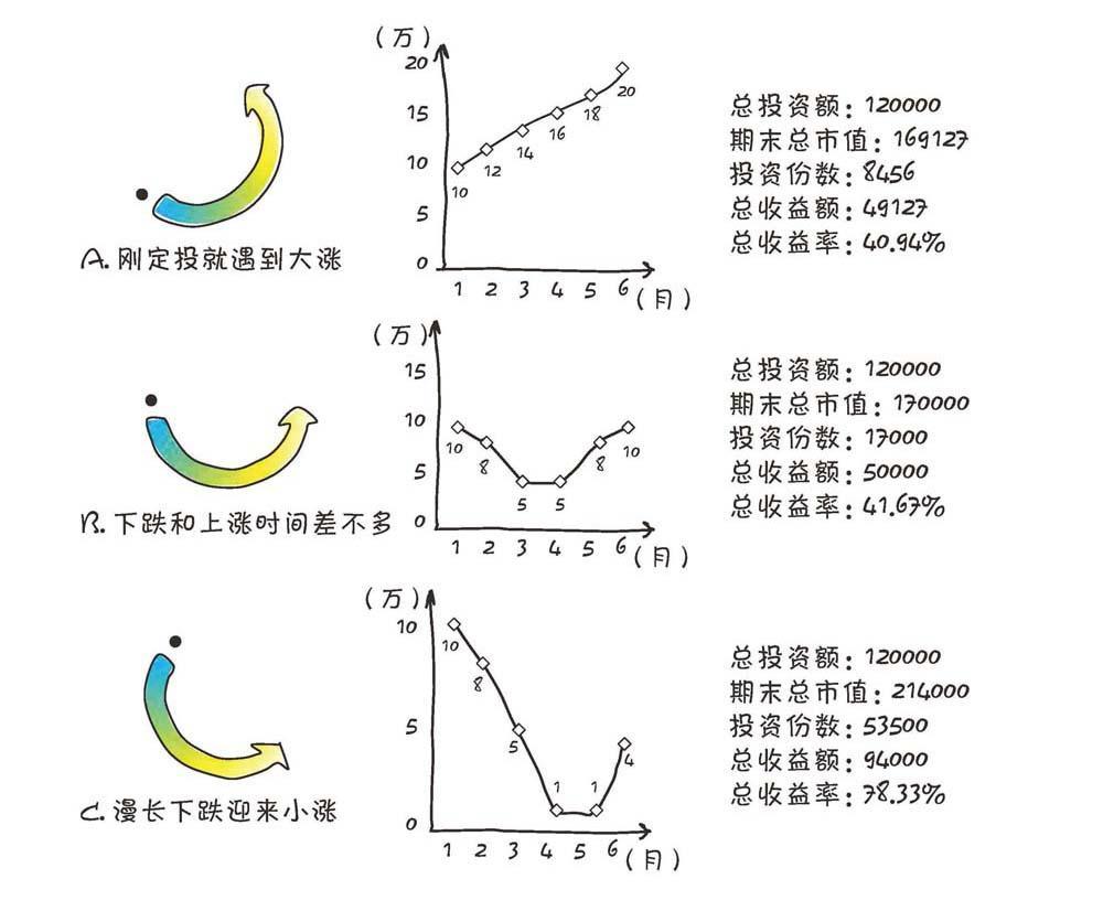 想不大白思虑题的话,我们能够用现实数据来测算一下。假设前提:起点一样,都从基金 10 元一份起头定投。遭遇 A、B、C 三种行情,但都对峙定投,每月定投 2 万,共投 6 个月。