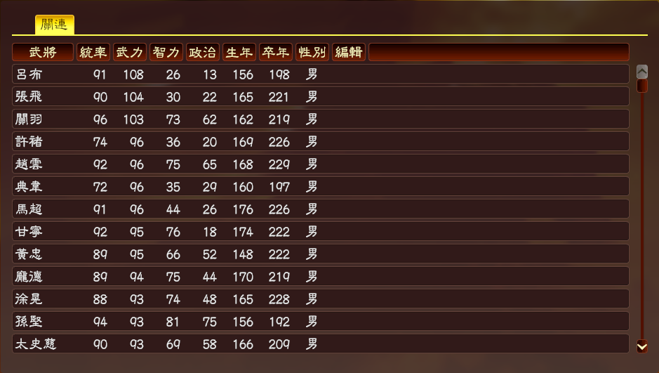 我别的一个失误是——编纂器里的数据确实是带了兵器加成的,而且我没找到查裸数据的办法。但那些有兵器加成的武将都是生成自带兵器的,能够看做他们的一部门吧?赵云的数据就没有青釭剑,招致赵云在差别汗青的面板数据纷歧样,在长坂之后赵云的武力是破百了,因为青釭剑不是赵云自带兵器,编纂器里就没有加成。