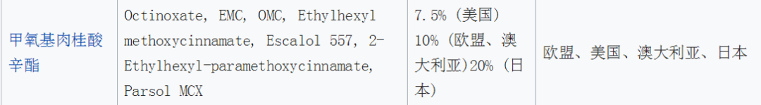 各个国度城S对防晒剂停止法定上限浓度,例如:欧盟对甲氧基肉桂酸乙基己酯(桂皮酸盐类)和二苯酮-3(羟苯甲酮类)的限量都是10%。