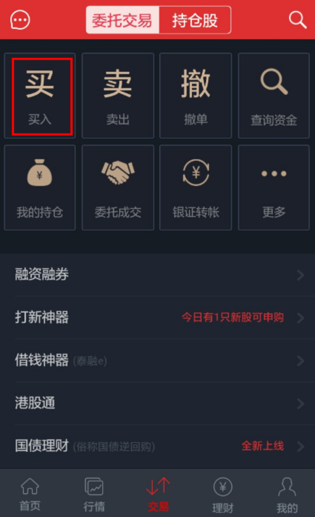 第一步:翻开手机APP,点击“交易”