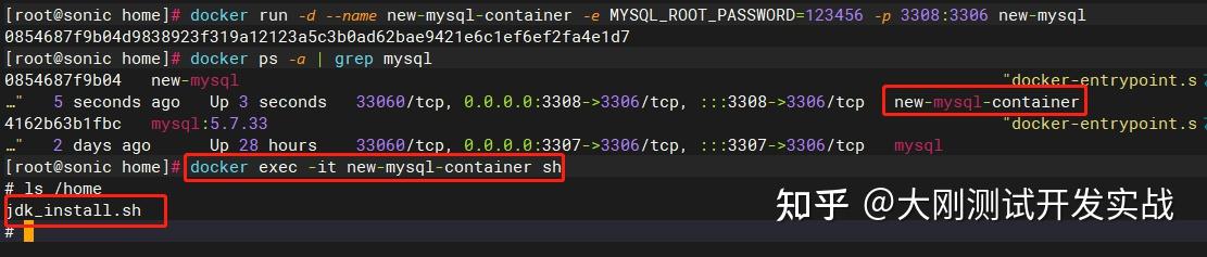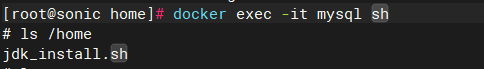 docker exec -it mysql sh能够看到,已经将jdk_install.sh文件复造到了mysql容器的/home目次下: