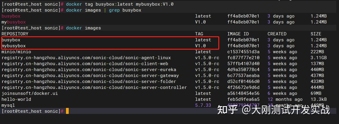3.修改镜像名称利用 "docker tag 原始镜像名称 新名称" 号令重定名镜像,如:docker tag busybox:latest mybusybox:V1.0,重定名镜像会新增一条镜像,相当于创建了一个副本,但ID不异。