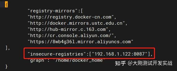 { "registry-mirrors":[ "http://registry.docker-cn.com", "http://docker.mirrors.ustc.edu.cn", "http://hub-mirror.c.163.com", "http://cr.console.aliyun.com/", "https://8wb4g36l.mirror.aliyuncs.com" ], "insecure-registries":["192.168.1.122:8087"], "graph": "/home/docker_home" }