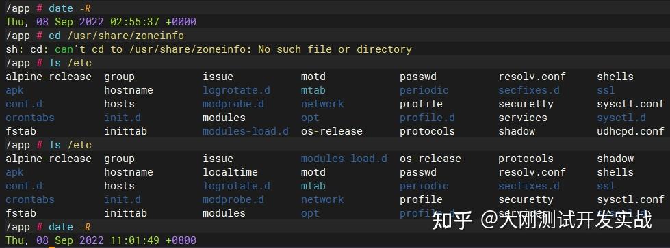 docker exec -it docker.ui sh # 进入docker.ui容器 ls /etc # 查看/etc下能否存在已经复造的localtime文件 date -R # 查看时区通过下图能够看出,/etc下已经存在了宿主机复造过来的localtime文件,时区为东八区,已经批改。