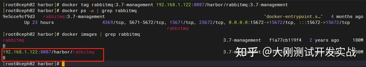 ③ 当地镜像打tag镜像名称需要定名为:ip:端标语/项目名称/镜像名:tag名,才气上传到该指定项面前目今,例如rabbitmq镜像,则名称为:192.168.1.122:8087/harbor/rabbitmq:5.7.33