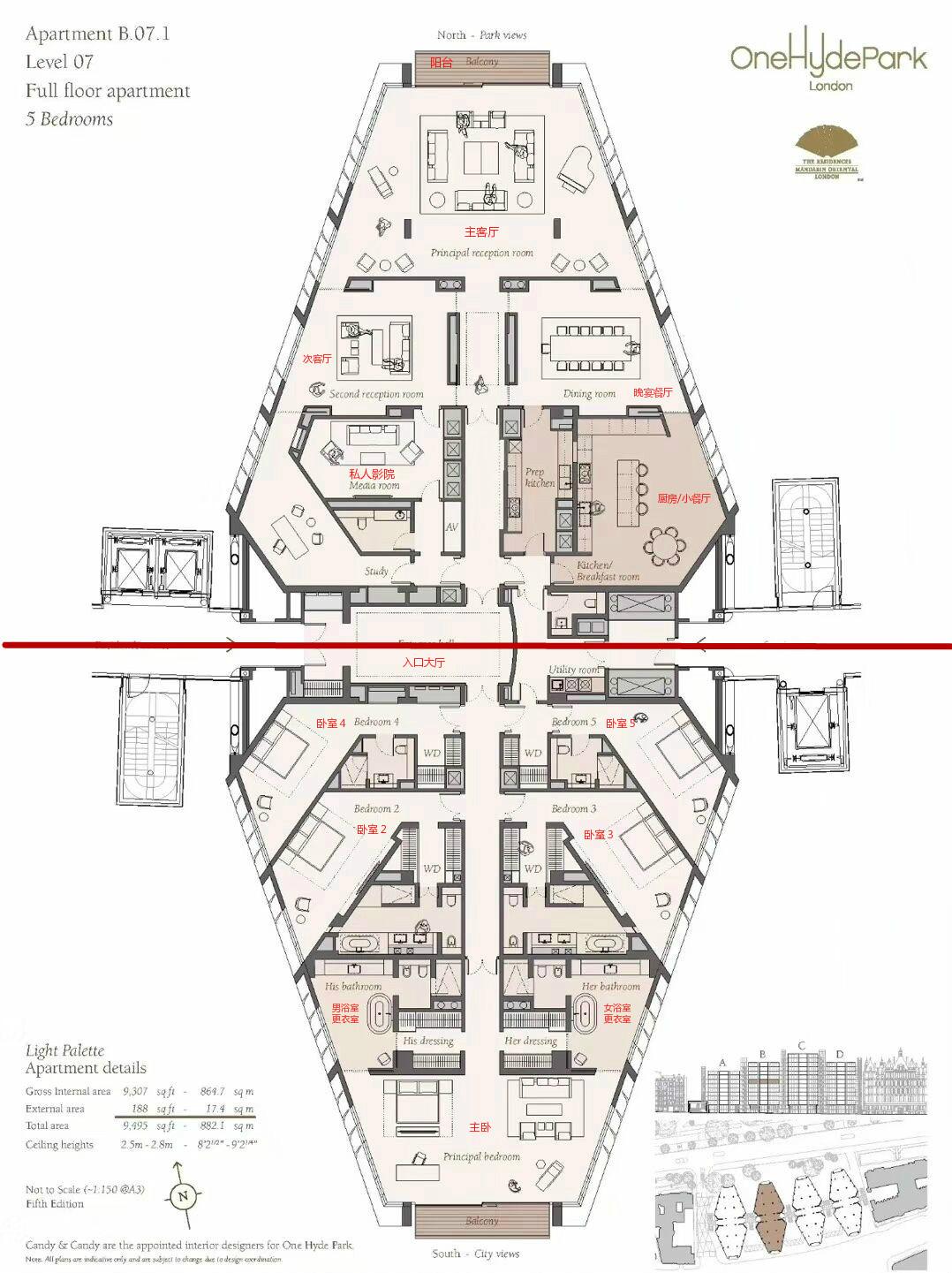 下图是海德公园一号的户型图纸,总面积870平米,同样的公共区域占一半面积。那套室第是菱形对称设想,图纸上半部门是公共区域,有主次两个客厅,大小两个餐厅以及私家影院,书房等。