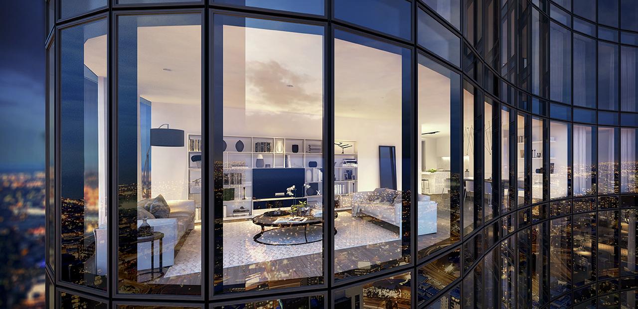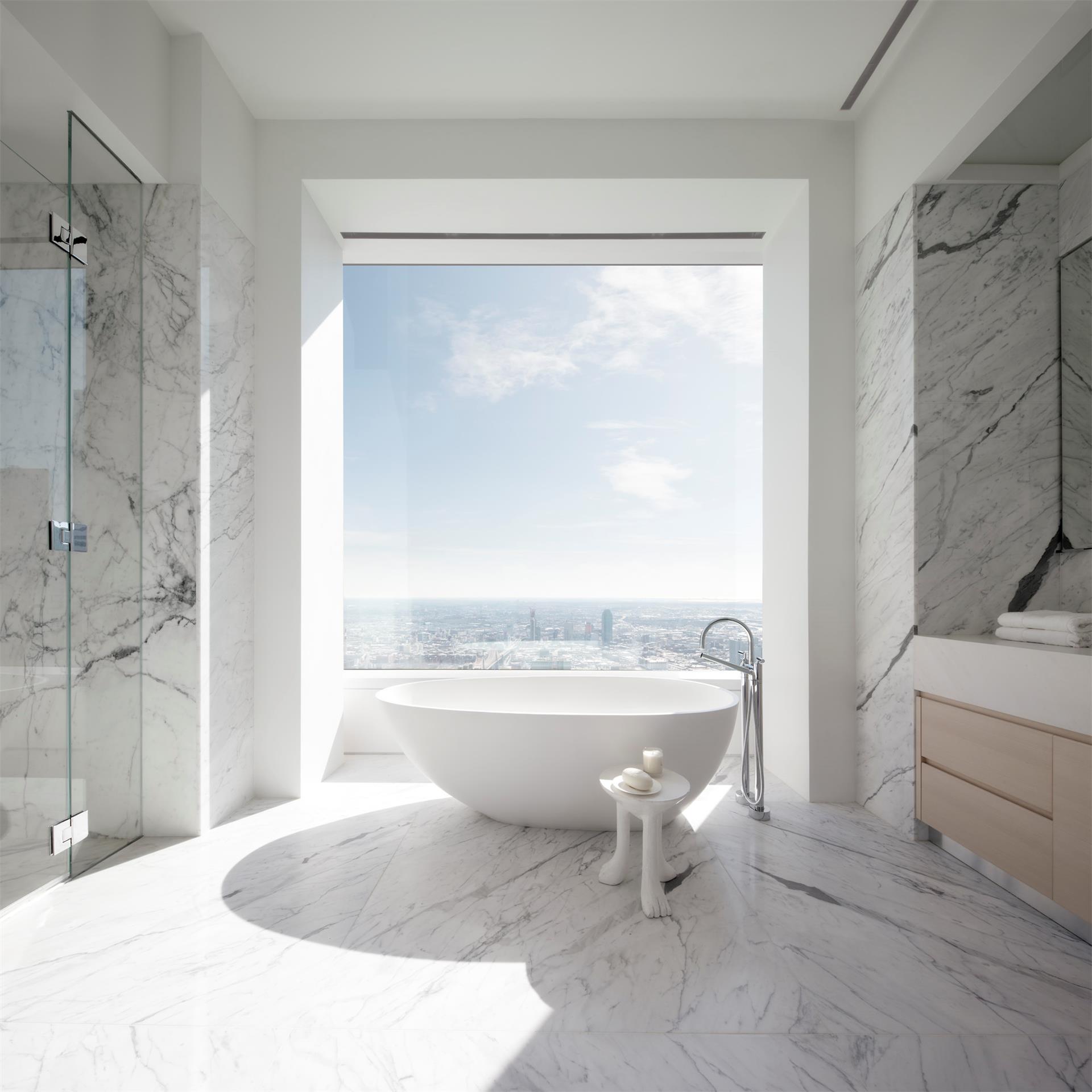 有的户型一个房间两面以至三面都是落地玻璃,窗外的超大天台栏杆也是通明玻璃,好比下面那套56 Leonard的空置高层室第。