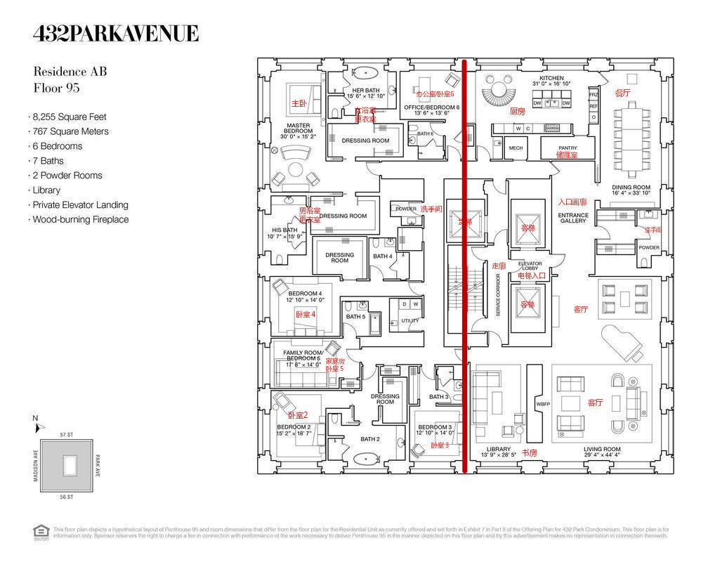 以公园大道432号 95层那套为例(下图是平面图纸),总面积约760平米,公共区域位于图纸右边,占总面积的一半。我们给加了中文标注,图纸左都是卧室、卫生间和更衣室,图纸右就是客厅、餐厅等。