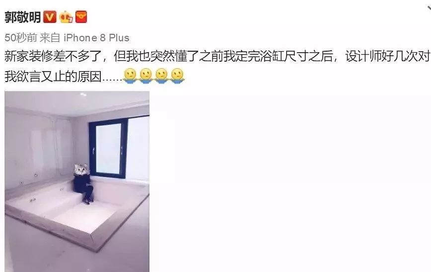 此前,郭导本身在微博晒新房,浴缸被网友吐槽像泳池。有人爆料,那套房子在南京西路上,价值1亿摆布。