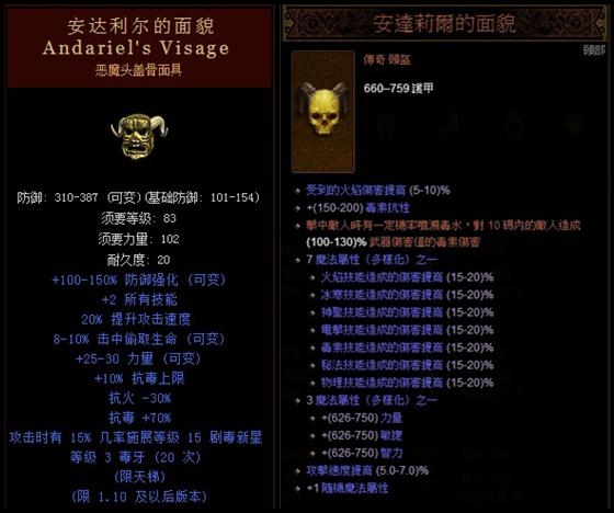 配备方面,带有“安达利尔”名字的是一个面具:安达利尔的面孔。那件配备在暗黑2和暗黑3中都有呈现。值得留意的是,那两件配备都有一个负面效果:降低火焰抗性。