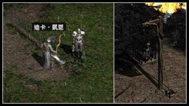 暗黑2中的凯恩,右图是凯恩被关在旧崔斯特瑞姆的笼子时的场景