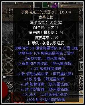 暗黑2中,李奥瑞克的法杖成为了召唤系死灵法师的最常用兵器,俗称“骷髅棒”,隶属性中能够看到,那件配备在各方面都在强化玩家召唤骷髅的才能。
