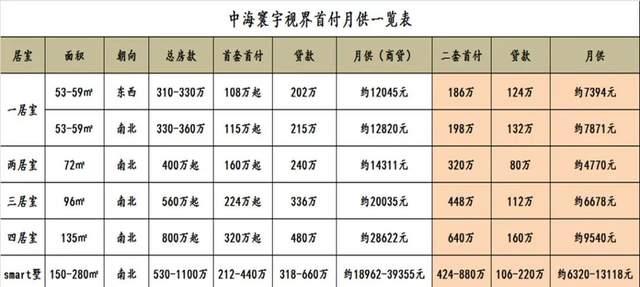 在售户型:一居约53/59㎡、两居约72㎡、三居约96㎡、四居约135㎡、smart墅约150-280㎡