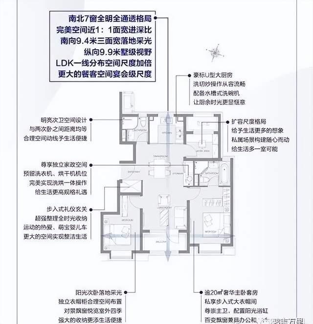 三面宽朝南的九宫格户型,面宽9.4米,采光好