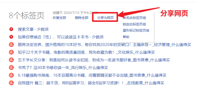 OneTab - 利用演示别的,你还能够将那些网页转换成链接或二维码,分享给别人: