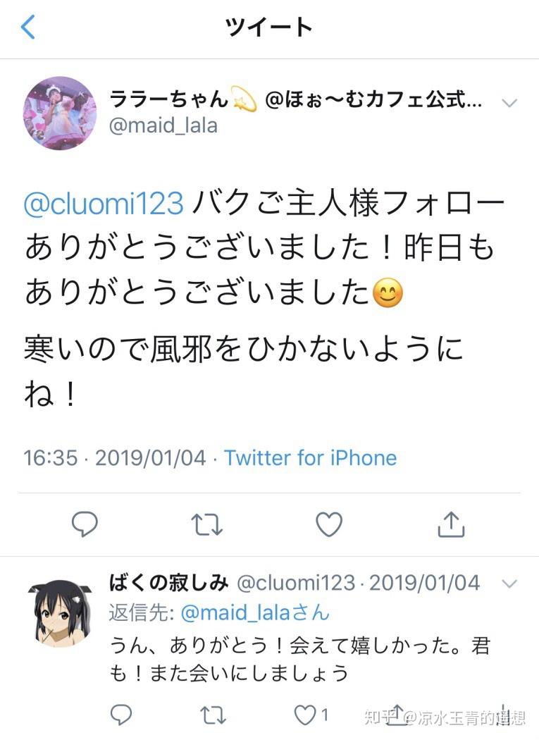 到了第二天晚上,翻开推特。发如今当全国午拉拉给我发了一条动静,说很感激我存眷了她,今天谢谢了,气候比力冷不要伤风了哦。此刻在大阪凌冽的冬日,一人独处的笔者心里倒也泛起些许暖意。