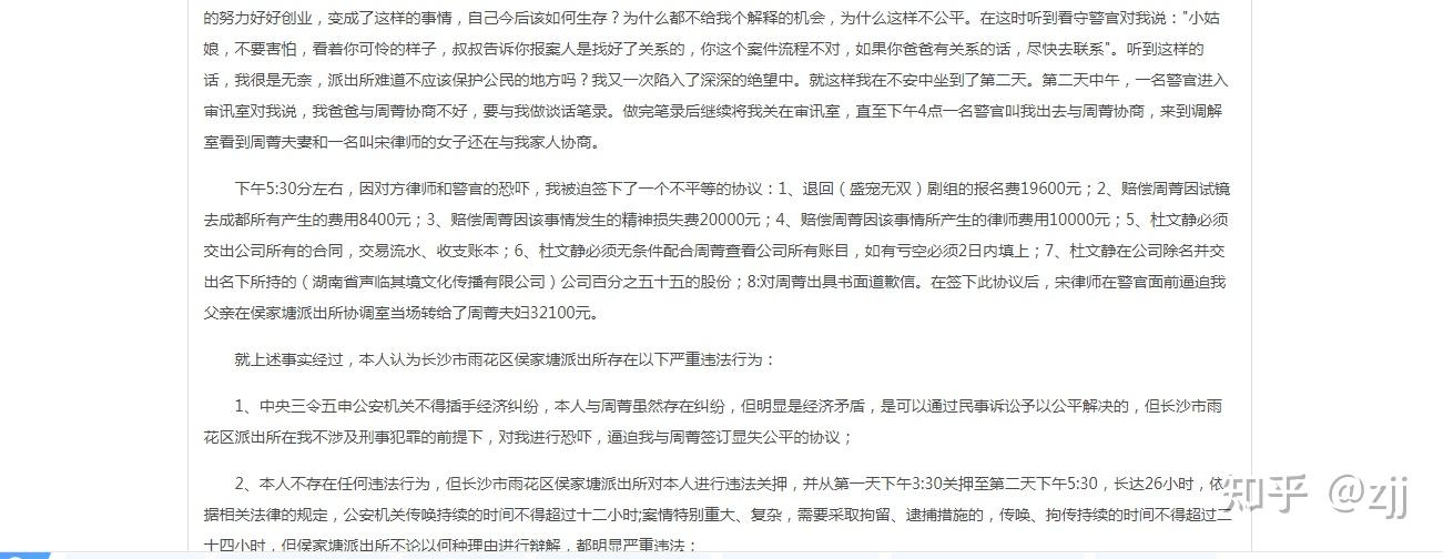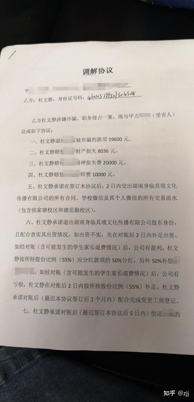 2019年6月6日前去长沙S雨花区侯家塘派出所报警。因为报案当天是端午节放假的前一天,三天后2019年6月11日上午我到派出所在此报案,并做完笔录,民警通知杜WJ到派出所停止查询拜访。杜WJ于下战书3点半到侯家塘派出所,查询拜访中民警因杜WJ不克不及对我提交证据中的疑惑做出解释,答复问题前后矛盾,在那种情况下民警暂扣杜WJ承受查询拜访。在被拘留前杜WJ打德律风给她父亲,其父抵达派出所后不分青红皂白对我没头没脑的骂了半个小时,并叫嚣的说今天杜WJ被关多久,要让我双倍奉还。我在派出所期待其查询拜访情况晓得凌晨1点,杜父在看过我出具的所有证据以后,欠好意思出头具名,要他的门徒周xx出头具名协调,对我说好话,说赔钱他负责,恳求我们谅解,可怜父母爱女心切的心意。因为我也身为人母,对全国父母心,庇护其子女的表情也能理解,所以并未对其父的辱骂过分计较。也觉得她父母也是受害者,究竟结果哪个做父母的都不肯摊上如许的事。在其恳求下容许当天上午到派出所停止息争。到下战书2点半摆布杜WJ叫到侯家塘派出所的调整室停止调理。在关于工作的实在情况停止询问中领会到,其带我们去四川成都停止“盛宠无双”剧组试镜并没有此事。(有完好灌音为证)其时在杜WJ的报前后签定调整协议。(因杜文静获得我的信赖后,邀请我与她合伙开公司,处置小主持人培训营业,2018年1月我与杜WJ合伙成立湖南声临其境文化传布有限公司(下称“公司”),杜WJ任法人代表并主管教学和财政工做,本人任监事并主管招生工做,合做期间屡次要求杜WJ供给公司相关财政材料和账户流水,但她以各类理由迟延,迟迟未能供给,在此次诈骗事务后,我严峻思疑她有不法损害公司利益的行为,所以在我跟她签定的调整协议中约定,除对本人的退款和补偿、报歉外,必需供给公司对外签定的合同,银行卡流水,微信收费手机流水及公司账目)