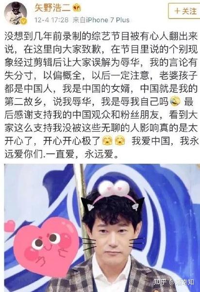很快,矢野浩二发微博报歉:说那个视频是颠末剪辑的,本身当初的言论有失分寸,以偏概全,以后必然留意,我很爱中国,也很爱中国人民。