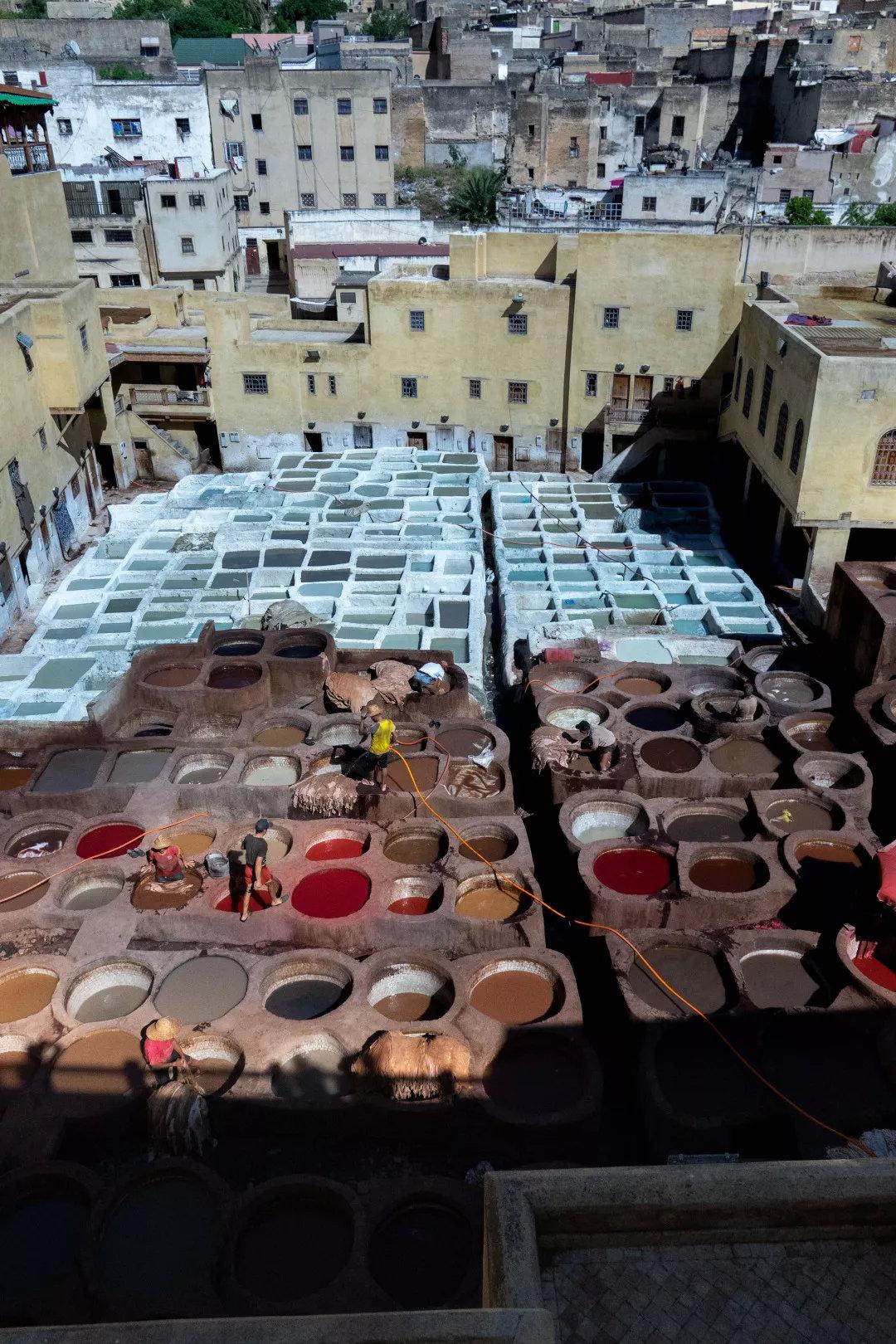 说到皮革,不能不提到菲斯的造革工艺,至今仍然接纳最传统的鸟粪脱毛工艺。古老建筑蜂拥着的一片皮革染坊固然臭味熏人,却十分稀有与奇特,纷歧样的人文光景老是引来无数猎奇的人们围不雅,我们也没破例。