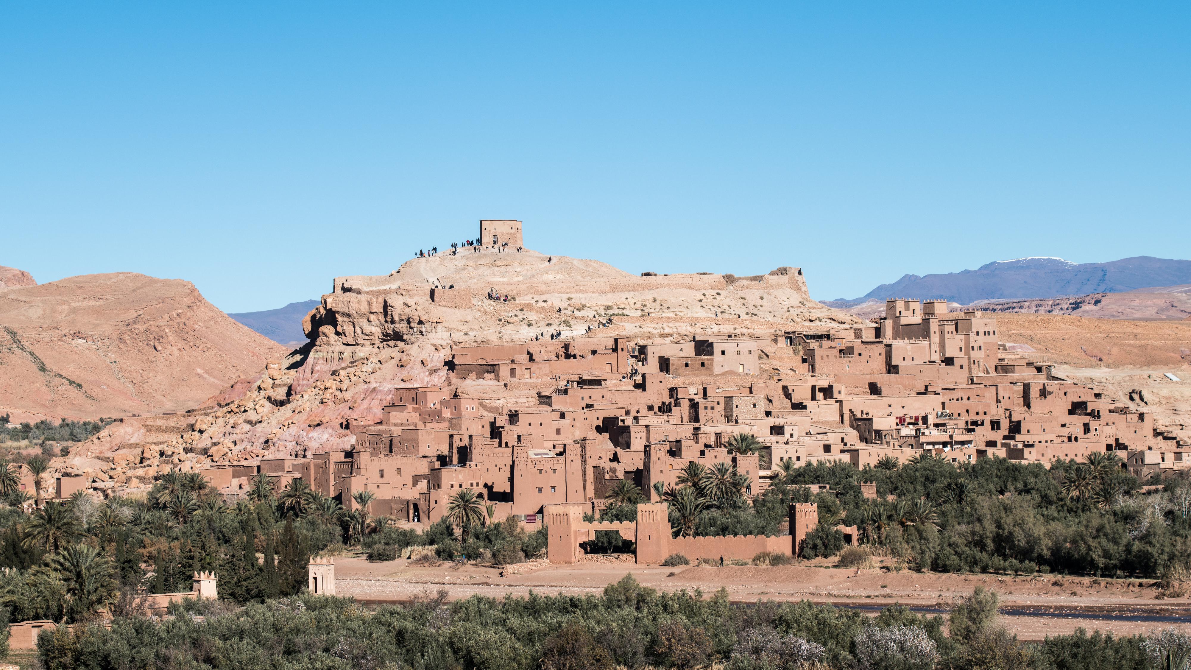 那座建于公元8世纪的城堡式防御村子。古城依山而建,层层叠叠,土黄色的砖墙似乎与土黄色的山坡融为了一体。城墙上精巧的雕琢斑纹,角楼的外檐,无不展示出摩洛哥南部特有的风情。