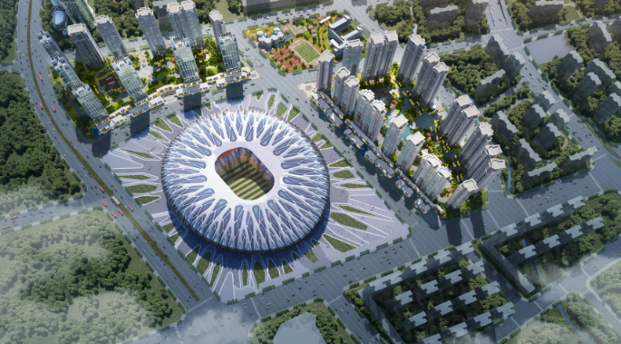 是的,那就是传说中的“球区房”。最末那个地块仍是被恒大拿下,打造恒大中央华府项目。