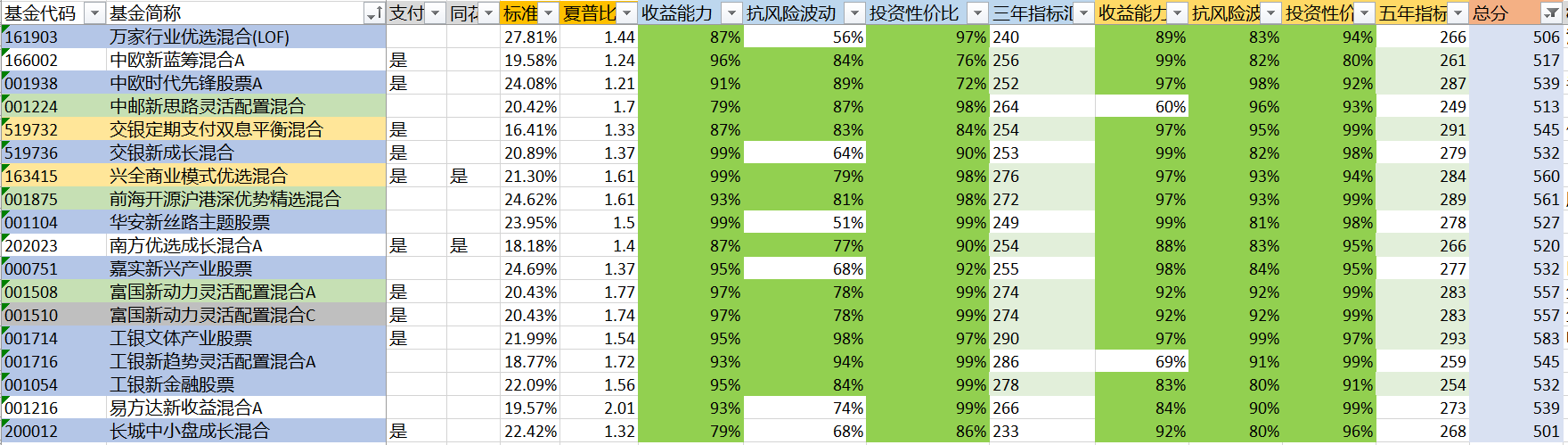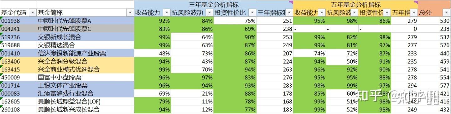 所以我的挑选公募基金逻辑是把抗风险颠簸放在一个比力重要的位置,按照那三项目标的三年和五年目标总分500 以内(需要每项目标均匀83.33以内,为了便利计算,我把目标的百分比换算成分数,假设公募基金目标有雅雷否则用绿色标注,凡是77%以内城S有大拇指雅雷)。