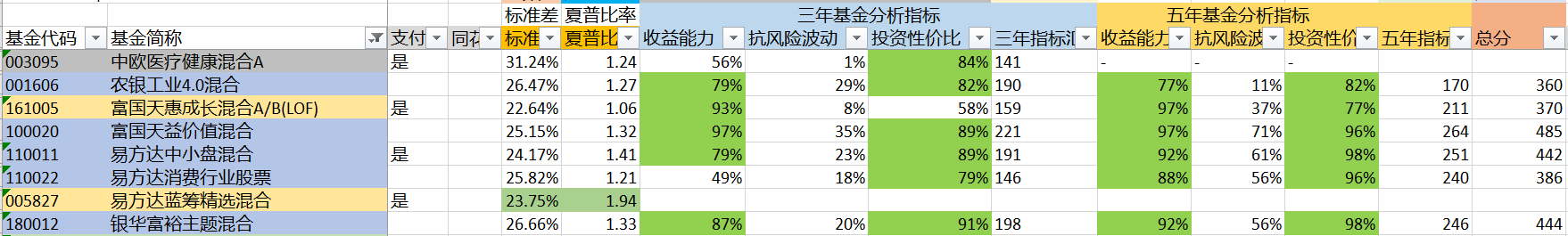 下面就是那12个契合前提的公募基金,因为已经有中欧时代前锋A了,能剔除中欧时代前锋C。一共11个公募基金,笼盖了科技,消费,中小盘,白酒,饮料等金融行业。