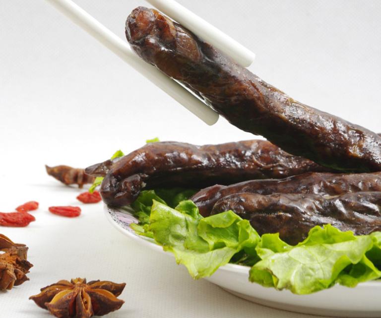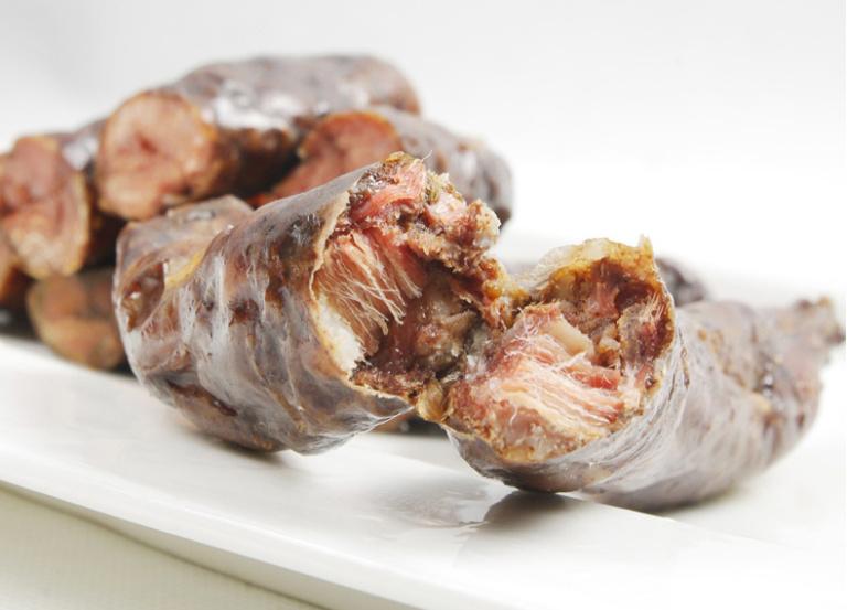 口镇香肠是用纯猪肉为原料,肥瘦比例1:9,然后配上丁香、砂仁、桂皮、花椒等香料,灌进肠衣里风干而成。废品的口镇香肠通体黑亮、里面肥瘦相间,嚼的那时候肉香陪伴着浓重的香料味,相当的好吃,即食、做菜搭配都能。