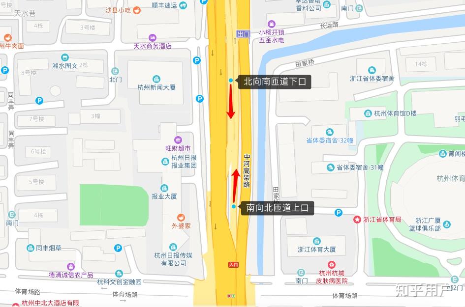 ▲ 中河高架体育场路收支口示企图环北立交的设想计划,让只想过个运河的人也必需走高架,招致中河高架南往北标的目的,不到800米的间隔,下口右侧3个,上口左侧1个右侧2个。