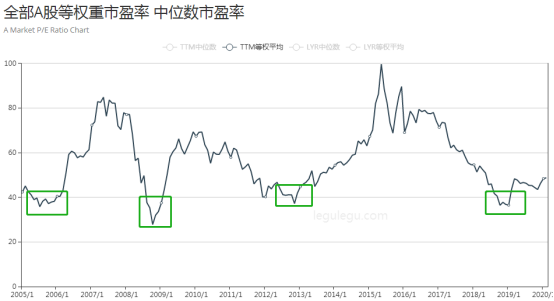 一般在大牛S的中后期,好比2007年、2015年那样的大牛S,S场的估值才会抵达高估区域,其它时间估值是达不到很高的位置的。