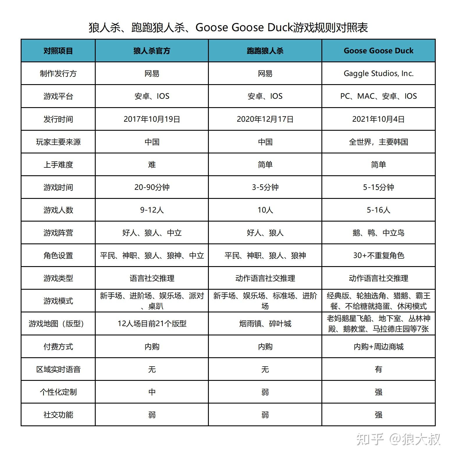 规则比照因为Among Us和Goose Goose Duck较为类似,就不在此处停止比照,下面次要对传统狼人杀(即官狼)和跑跑狼人杀、Goose Goose Duck两款变异轻量化狼人杀游戏停止比照。