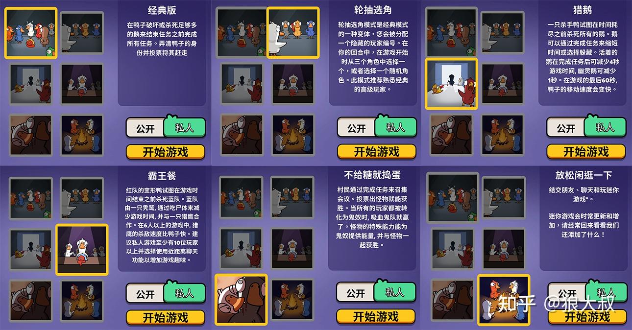 鹈鹕游戏形式弄法为了确保每个玩家都能享受游戏的乐趣,Goose Goose Duck供给了5+1种游戏形式:典范版(仅有鹅与鸭两种角色)、轮抽选角(合适高阶玩家)、猎鹅(躲猫猫)、霸王餐(场景为餐厅的谋杀盛宴)、不给糖就捣蛋(专为交伴侣设想的形式)5个游戏形式以及一个休闲社交形式。以及老妈鹅星飞船、地下室、森林神殿、鹅教堂、马拉德庄园、保持殖民地、黑天鹅七册地图。以上所有形式和地图均撑持5-16名玩家停止游戏,且撑持对人数、角色、难度、交换体例、公开私家等的订造。不管你是想来一局本格推理、老友对决、社交Party或者是线上会谈,都能够全方位的满足你。