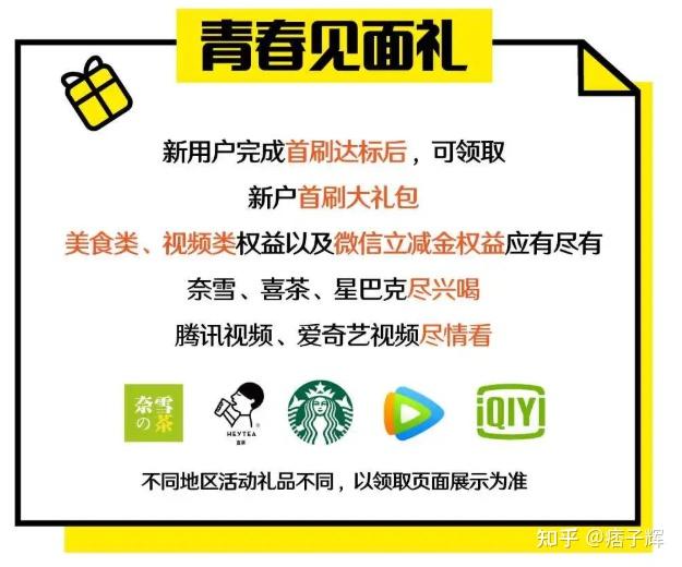首刷达标后,可兑换美食类、茶饮类、视频类权益或微信立减金;(奈雪、喜茶、星巴克等)月月领视频会员
