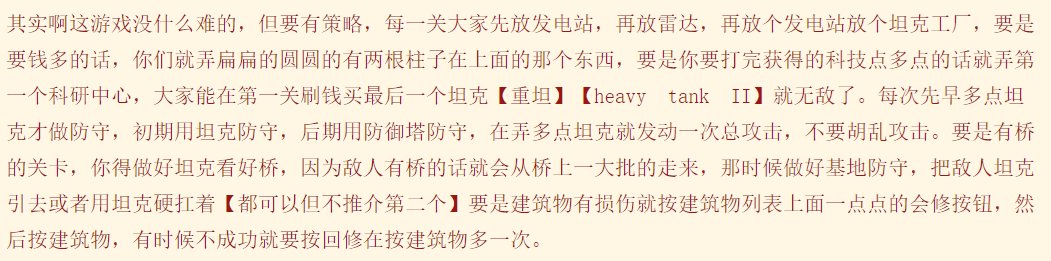 十分典范的“推线”类思绪肉搏游戏(也是梦境中生前第一个在4399上玩的肉搏游戏),局限性是画面和声效都略为简陋,好在BGM很是小双侠(原曲:Glorious Morning)。一共分五个黄金时代,前四个黄金时代兵种只要一般来说的三品种型,第四个黄金时代多了一种超等兵。别的还能建造防卫建筑物和利用特定专业技能。在肉搏游戏中击破仇敌能获取用做鲜果汁和防卫塔的资金和用做晋级换代黄金时代的经历,特定专业技能只要CD消耗(奇异的是第三黄金时代的特定专业技能是“飞龙盾”而非其他黄金时代的各类“世界地图炮”)。肉搏游戏操做看似简便,但若不利用技巧很容易打成乏味无聊的拉锯。