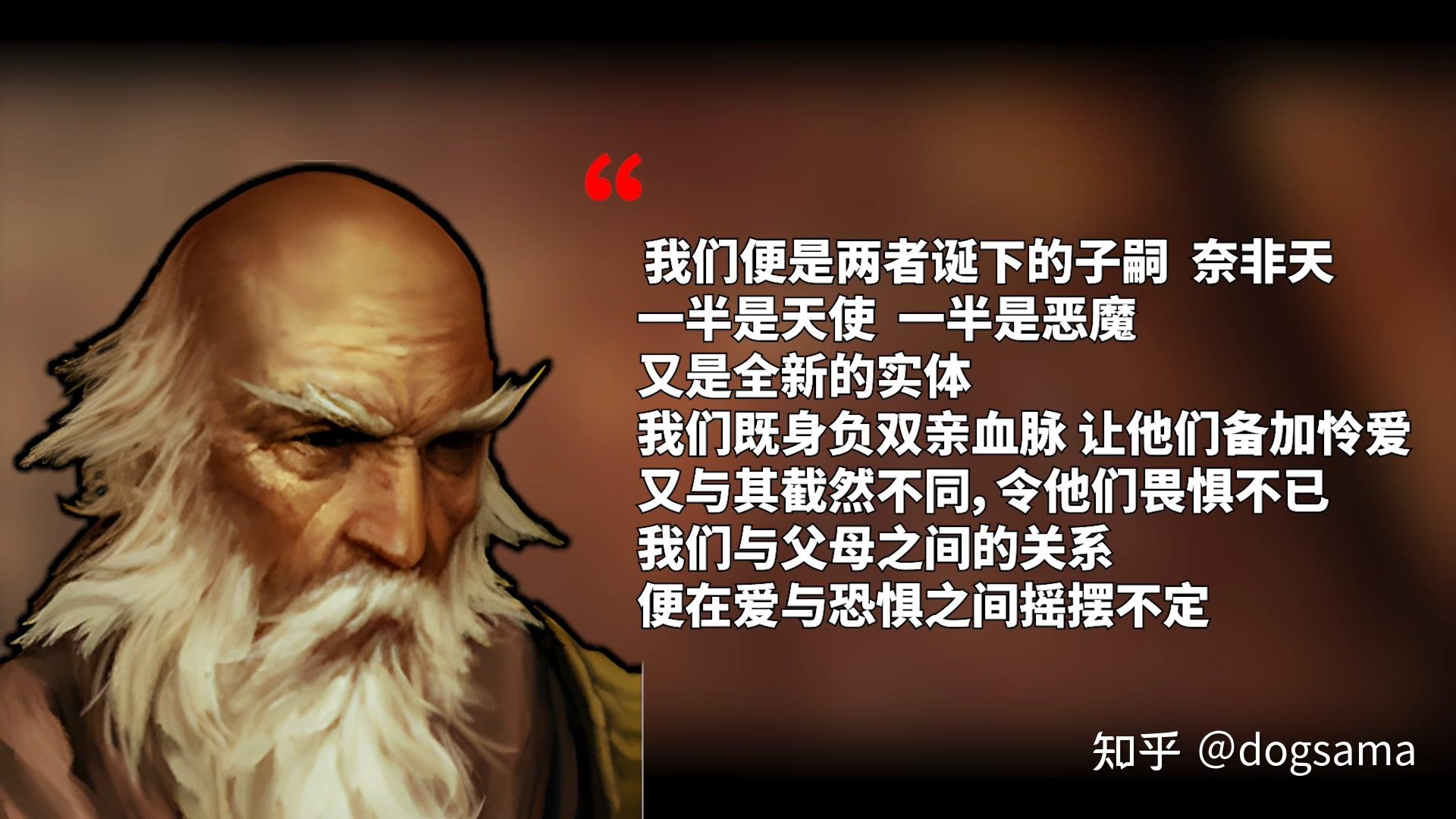 对奈非天的描述在《凯恩之书》里有一段有趣的话:“我们即是两者诞下的子嗣:奈非天,一半是天使,一半是恶魔,又是全新的实体。我们既身负双亲血脉,让他们备加垂怜:又与其判然不同,令他们畏惧不已。我们与父母之间的关系,便在爱与恐惧之间扭捏不定。”