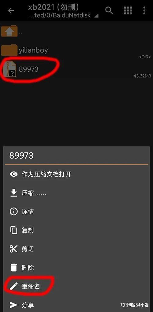 进入文档夹以后,找出阅读的文档,如图红圈所示。重要的一步:请点击位数文档长按!请点击位数文档长按!请点击位数文档长按!曲到再次呈现 红圈2所示的“从头定名”。接着修改前缀为 .7z