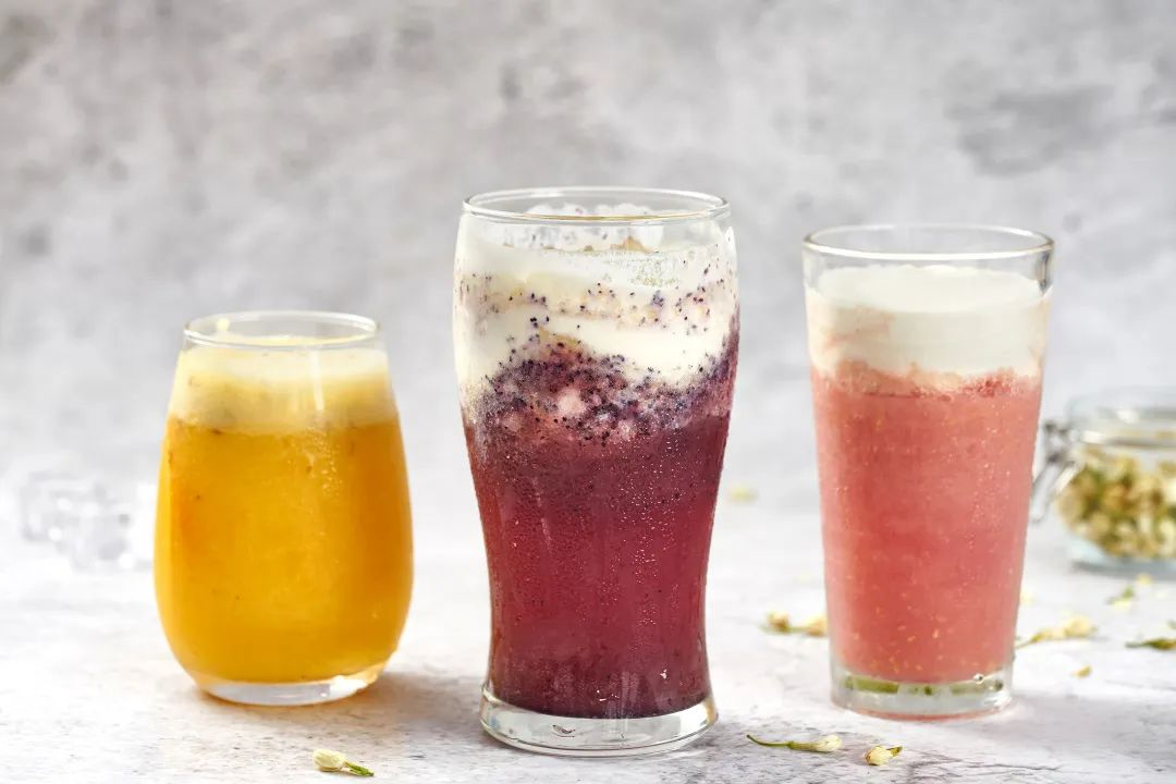 将搅拌好冰沙倒在杯上,最上参加一层奶盖即可