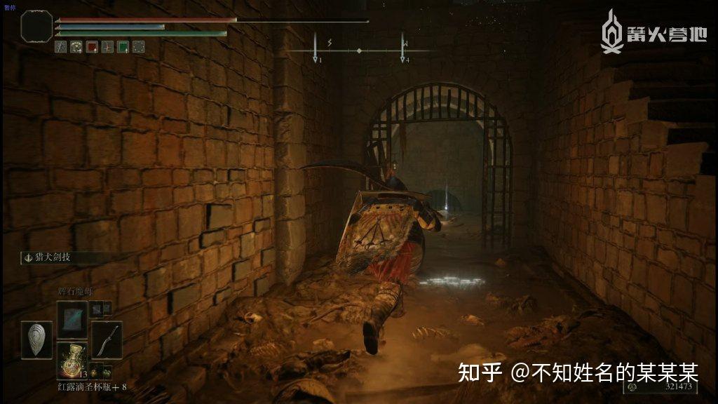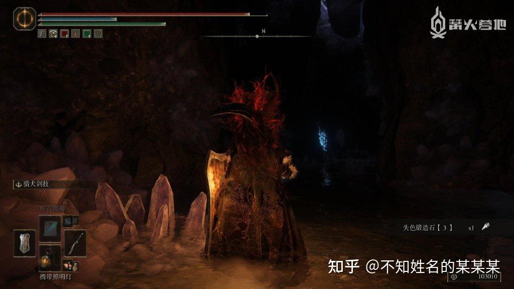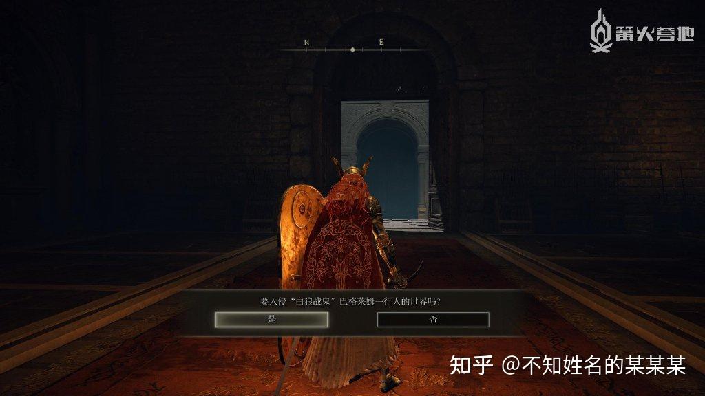 然后来到南边的「无主猎犬的封印监牢」,进入监牢后不要往前走让 Boss 呈现,中心点右边空中上有金色符文,召唤「“半狼”布莱泽」一同击败 Boss 获得兵器「猎犬长牙」。传送回本来的世界后和旁边的布莱泽对话能够获得「失色锻造石 2」,再对话到反复。