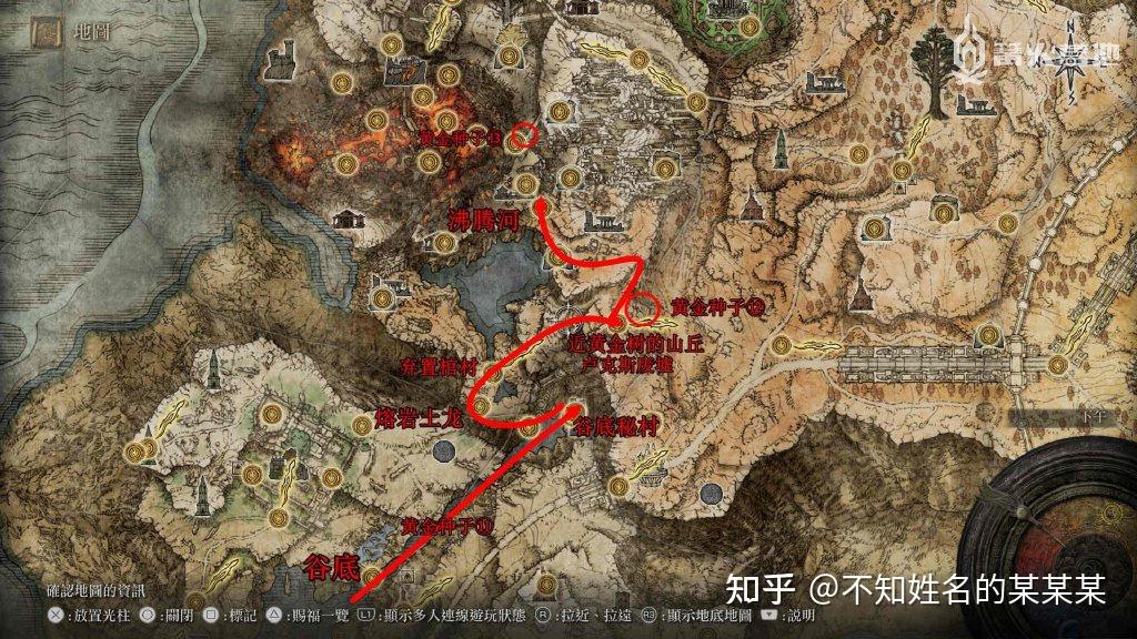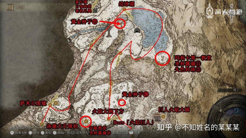 在起落机前举起符节,进入巨人山顶,沿着下图的道路骑马前进,在赐福「结冰湖」的南边有两个巨人的位置能够看到一棵小黄金树,能拿到「黄金种子 ㉗」。来到到赐福「火焰大锅下方」,踩着链条进入东侧,击败 Boss「火焰巨人」【Boss 奖杯 / 成就 ㉑】,然后来到赐福「巨人火焰大锅」。