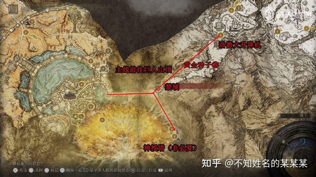 通过起落台上楼后,再次来到王城外围,如今有两条路能够选,南边是前去神授塔,半途会碰到 Boss,能够先不打,选择间接从岔路处的起落台往下来到禁域,继续往东走,中间会看到一棵小黄金树,能拿到「黄金种子 ㉖」,继续前进会来到「洛德大起落机」。