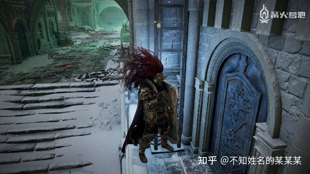 不断往前走,击败深处的 Boss「“凶兆之子”蒙格」【Boss 奖杯 / 成就 ⑳】,触碰赐福「弃置凶兆的大教堂」,翻开前方宝箱获得符节「黄金树的恩德+1」,打一下宝箱背后的石墙,会呈现继续向下的路,那里需要一路往下跳,先沿着三条木板下落,然后从凸出的石板继续下跳,目前所见的底部是假的,以平安高度跳上去之后会碎裂并落到底部,激活赐福「癫火封印」,前方会有一个庞大的门,先不要有进一步的动做了。