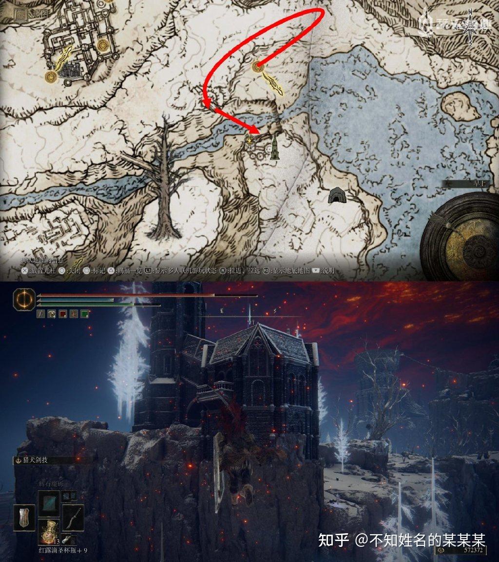 击败 Boss 后,还能够在西边停止摸索。先从赐福「摩恩城(城墙前方)」动身,不进入城墙内,而是向西走绕到「卡尔洗礼教堂」,能够拿到「圣杯露滴 ②」。