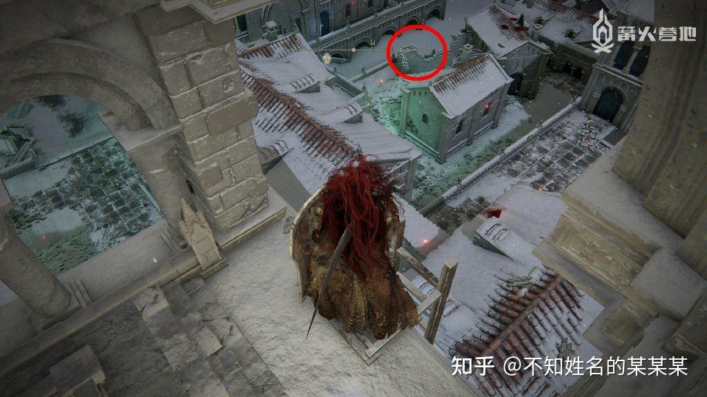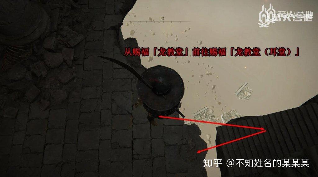 从赐福「大桥侧边」回头下起落台,下环形楼梯分开建筑到下图位置,跳到下方平台,到有几个尸体躺在地上的平台,有个窗口没有尸体,能够选择本身躺在上面,会传送到全新区域,挑战 Boss「“龙王”普拉顿桑克斯」【Boss 奖杯 / 成就 ㉘】。