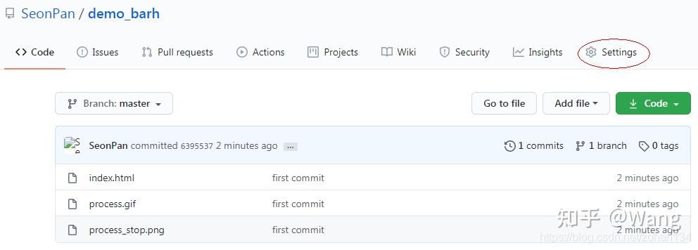 最初一步上传时会相继弹出 github 账号密码输入框,输入后即可期待上传完成。完成后回到 github,发现几个文件已经躺在仓库里了,再点击 Settings: