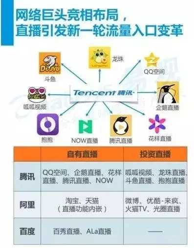 BAT巨头对曲播的喜爱也可见一斑,此中腾讯的规划堪称疯狂,涵盖游戏、体育、泛娱乐等多个层面,自有的曲播营业包罗QQ空间、企鹅曲播、把戏曲播、腾讯曲播、NOW,投资的曲播平台包罗呱呱曲播、斗鱼曲播、龙珠曲播等。