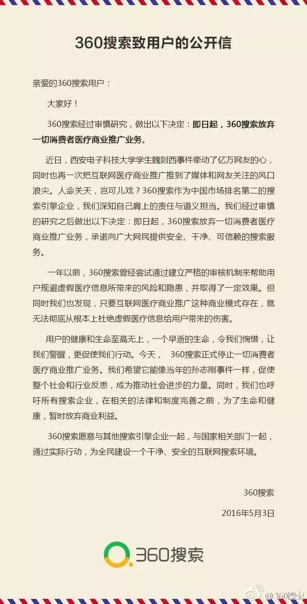 魏则西事务发作后,百度发布了一封来自百度内部信《砥砺风雨坚守任务》,诉说本身的那份“委屈”。也正在那时,一贯天不怕地不怕的“红衣教 主”周鸿祎又给一个神补刀,发文“我们决定彻底肃清医疗贸易推广!”