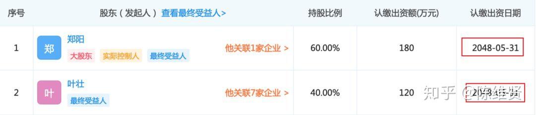 那家公司的 2 个大股东固然认缴出资额分配得很好,但是认缴出资日期已经摆设到了 2048 年……