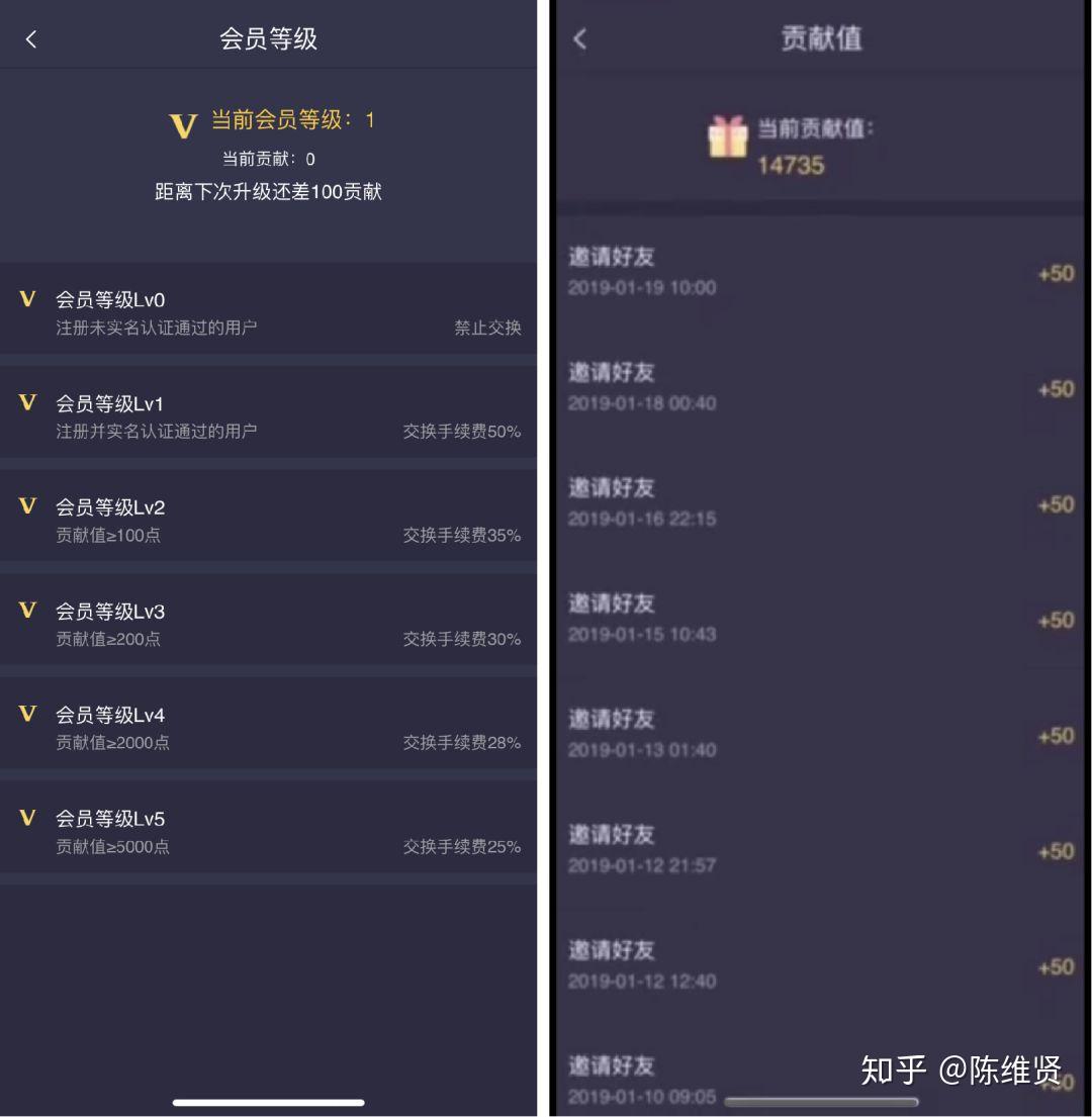 会员品级则跟奉献值相关,想要获得奉献值,只要一个办法,就是推广。用户每保举一小我,就能获取 50 点奉献值。