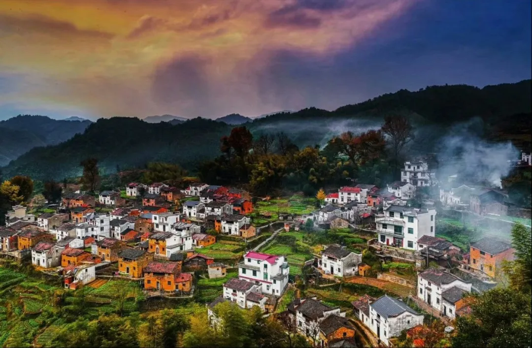 层层的田野、盘曲的巷陌、环绕的青山,房舍似菇群集于树下,青烟似云霞升于林间,村墟、野田和连山构成典型的歙X形象。