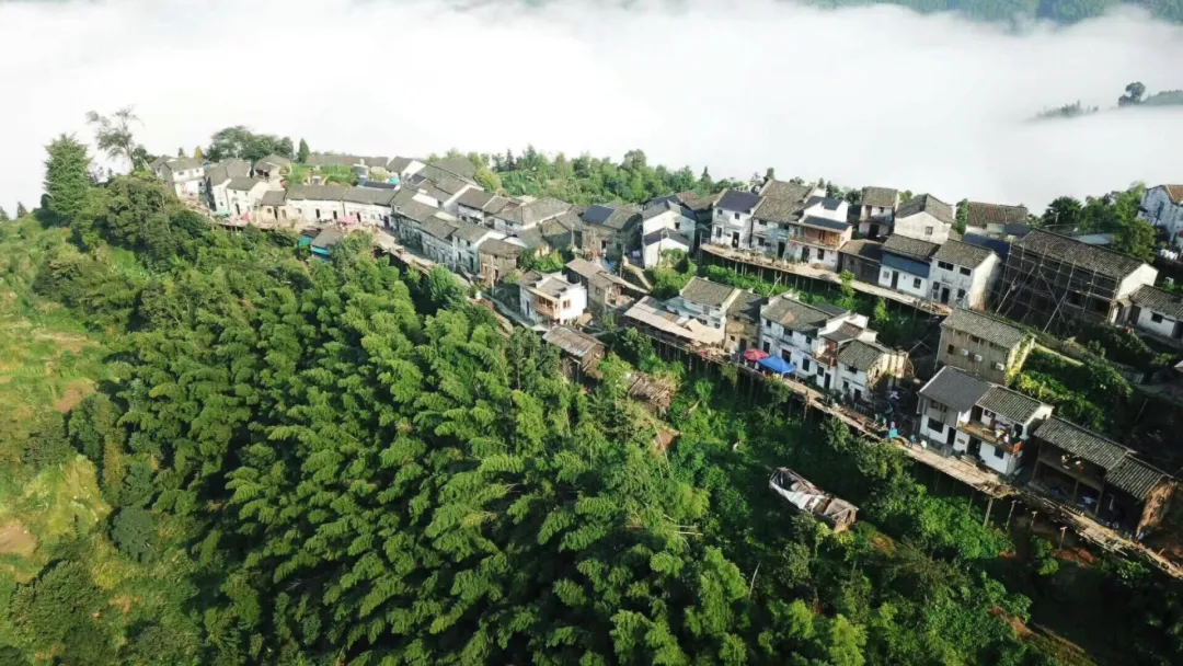 它安然憩息在皖南的崇山峻岭上,四周被郁郁葱葱的绿植和满山茶园紧紧蜂拥着。千亩杉树茶园与蜿蜒盘旋的扶贫路交相照应,构成一幅壮美的塘村画卷。